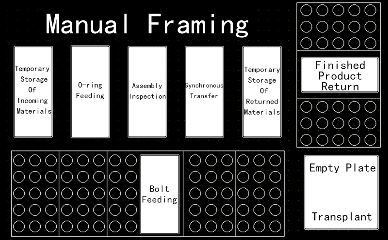 The assembly sequence is: manual bolt placement (conveyor) - bolt flipping - bolt temporary storage - O-ring feeding - O-ring detection - O-ring positioning - O-ring pressing - detection - finished product return rotation.